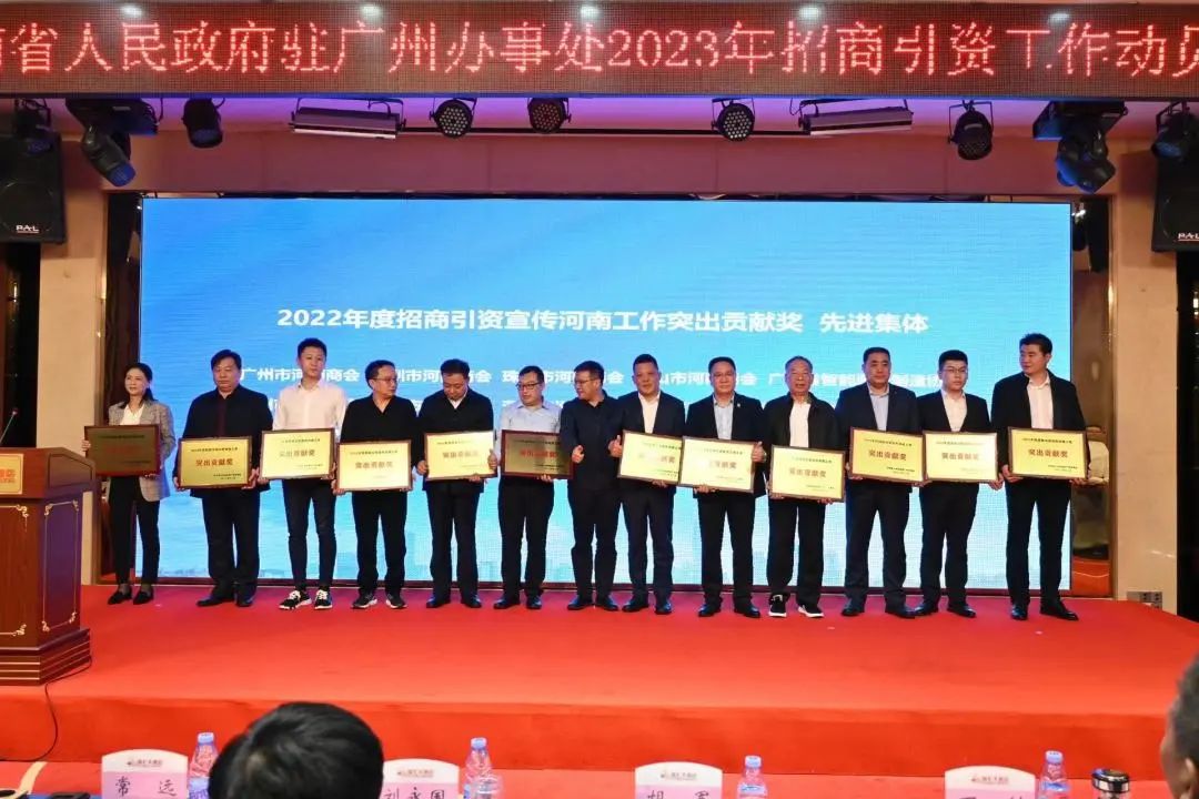 河南省人民政府驻广州办事处主任胡军发表致辞讲话,首先对前来参会的人员表示由衷的感谢。招商引资项目取得的重大成果,离不开大家的努力和支持,在今后的工作开展中,希望大家凝心聚力,共同为河南的发展做出新的更大的贡献! 河南省人民政府驻广州办事处副主任赵青林宣读获奖名单,由于促进招商引资工作突出,我会荣获“2022年度招商引资宣传河南工作突出贡献奖”荣誉称号,秘书长万剑陪同参加此次会议。