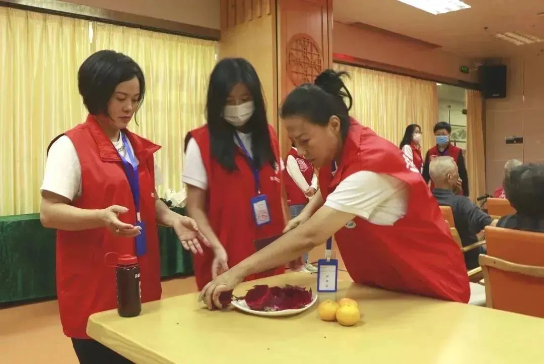 来到活动现场,义工们便开始将带来的水果清洗切块,摆放在老人们身旁的桌子上,然后陪着爷爷奶奶唱歌、聊天,现场气氛欢快,爷爷奶奶的脸上挂满了笑容。